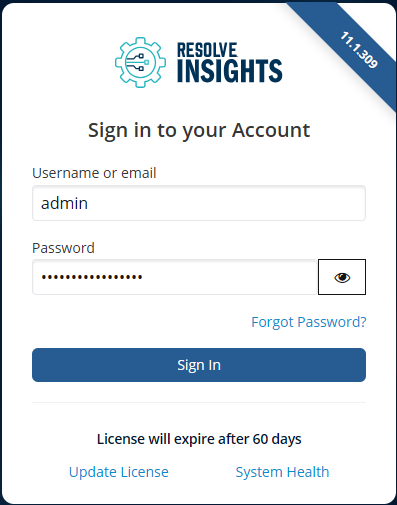 (Optional) If this is the first time you are logging in to Insights, you will need to set a license for it. To do this, click Update License and input the license key provided by your Resolve representative. If you are already using a license, the Insights login screen provides information about its expiration date. To update your license, follow the same steps for the new license key.