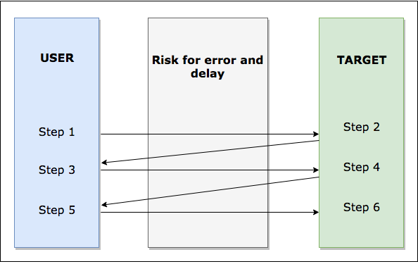 The diagram below visualizes how the risk of error and/or delay decreases when automation is introduced. This approach accelerates the processing time and removes much of the effort from the user. As a result, the potential for errors and delays is minimized. The idea is not to remove the human out of the process but to automate manual tasks that are repetitive, simple, and slow.