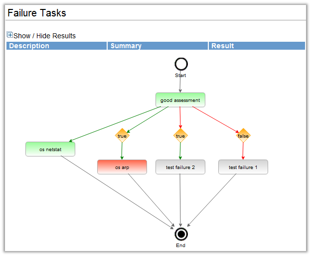 Each "Result" condition is underlined. When an end-user clicks a "Result" condition, a pop-up window displays the execution details for that task. Click a red (critical) or yellow (warning) condition to discover why the task failed to complete or what the errors might be. The results are determined by the Assessor. It is up to the Runbook developer to decide how the Assessor interprets the results and how those results are communicated to the user.