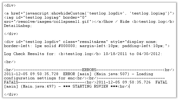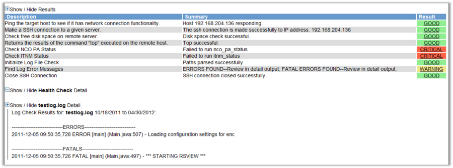 In the following example, the detail tag generates the HTML for a collapsible section of data (the detail results from the health check and the log file results tasks from the sample automation). Because the Runbook can be used to analyze multiple log files, generating the HTML was necessary to avoid cluttering the wiki page with raw data. The wiki code is: