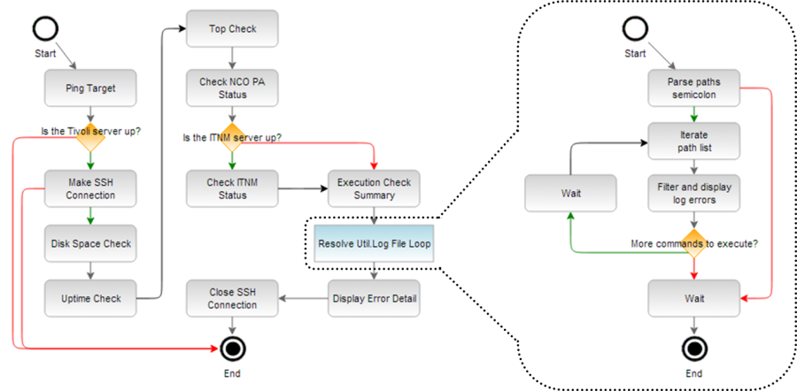 The {model} tag is used to display the automation model on the wiki document page. It is convenient if a developer designing a wiki document page wants the end-user to see what the Runbook looks like and see execution results in real-time. As a Runbook processes, the automation model is updated and each ActionTask or sub-Runbook changes color with reference to condition and severity.