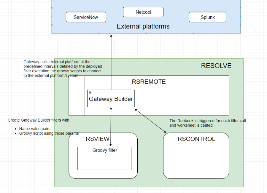 - Runs at intervals defined by the gateway filter and executes custom logic written in Groovy to query external systems for alerts/tickets.