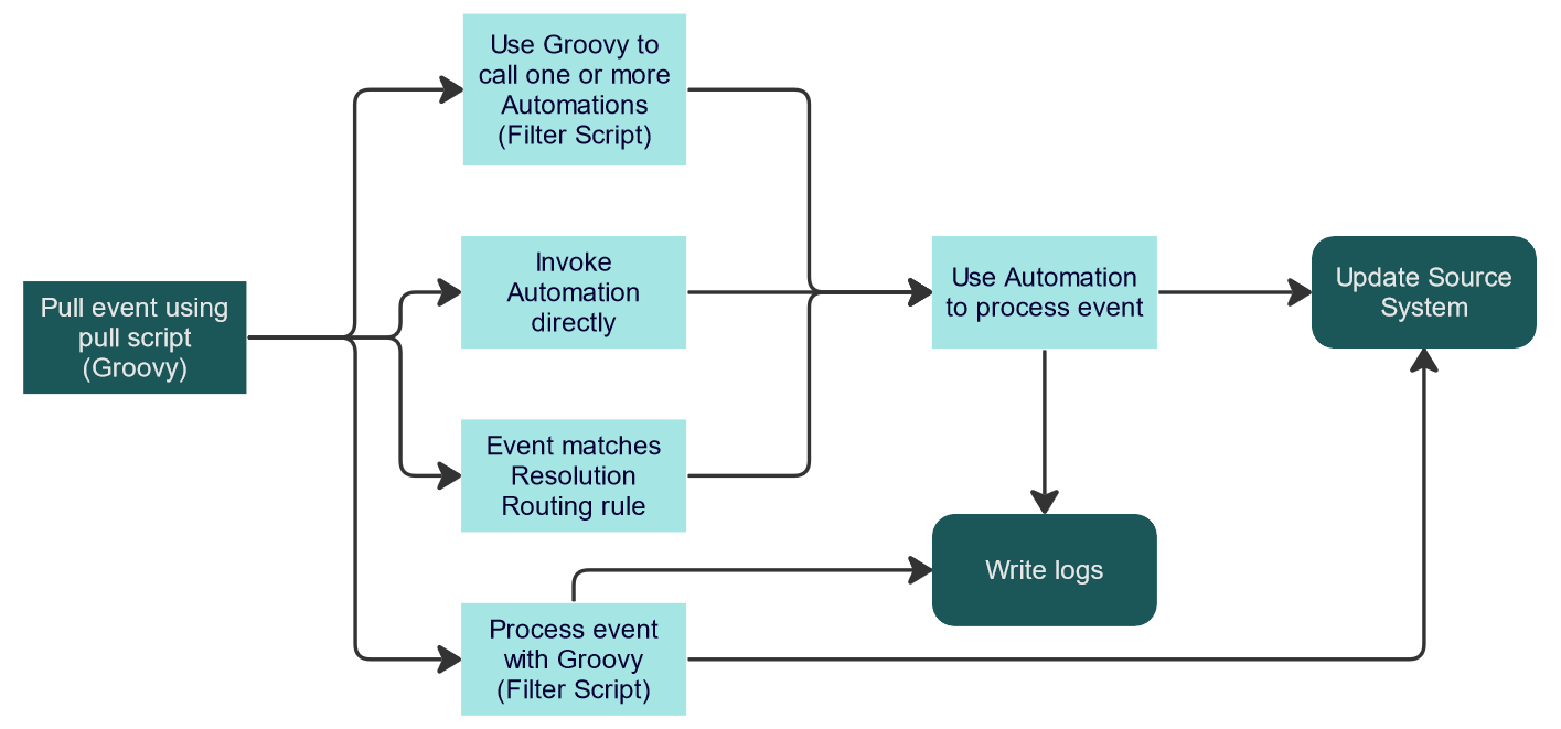 The event workflows starts at the pull script. In it, you write Groovy code to connect to your integration and retrieve events, alerts, or any kind of data or simply update the system that you are integrating with.