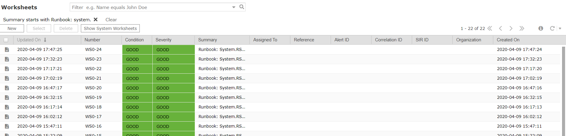 Runbook execution and assessed results are stored and viewed in a Worksheet, which collects returned information and provides a convenient reference for the state of one or more selected Runbook executions. Essentially, a Worksheet provides a history log of all actions carried out by Actions Pro. The Worksheet stores the results from the ActionTasks executed by the Automation Model or interactively executed by operators and service desk agents. A Worksheet can also reference records from external systems, such as incidents from a ticketing system or an alert from an event management system, which allows users to see automation results tied to a particular ticket or event.