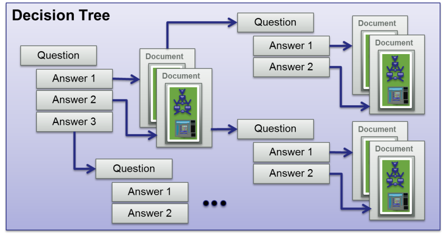 Decision Trees allow knowledge documents (wiki pages) to be organized into a structured workflow. Similar to an automation model, a Decision Tree model resembles a flowchart, and defines navigation paths by connecting decision points (questions), answers, and documents. Users then navigate through the Decision Tree to perform self-service troubleshooting.