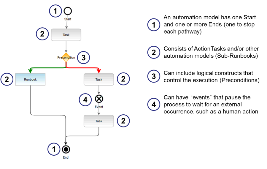 All Automation Models include entry ("Start") and exit ("End") points, actions (ActionTasks), decision points (Preconditions), and conditional statements. (See Automation Development). They determine which ActionTasks to execute when, how data is passed between them, and how to respond to the results. An Automation