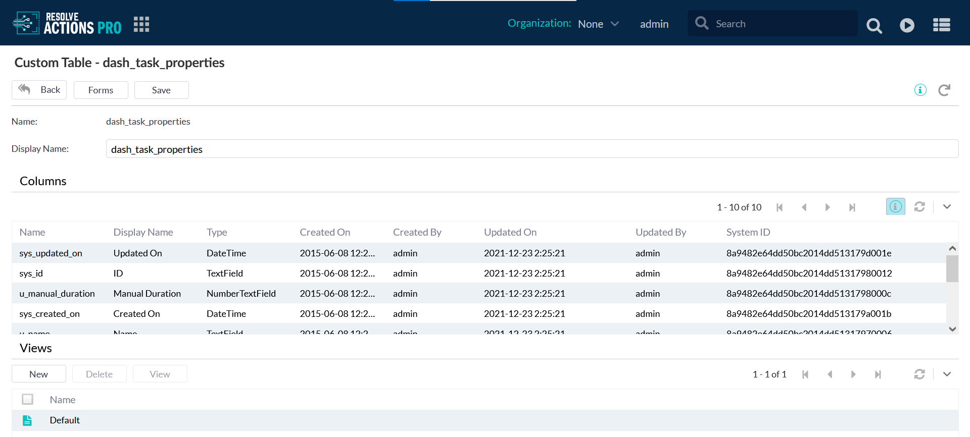 - Form (Edit) View: shows name, column headings, and different filtered views, with link to the associated custom form Admin rights are required in order to create Custom Tables.