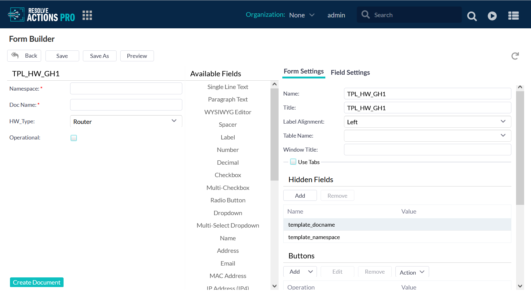 - The Form Editor allows you to specify the number and types of fields to be displayed in the final document page (to be filled in by the page viewer). The editor screen has three panes. The Fields List shows all the fields added to the form by name with a default value. A field name can be changed by double-clicking on the name in the Fields List or configured in the Field Settings for that field. A field can be removed using the list. The order of the fields can also be changed by dragging fields around into new positions. "Namespace" and "Doc Name" (for the newly-created document page) are required when using the form and are automatically filled with the name entered in the "Add Document" dialog box.
