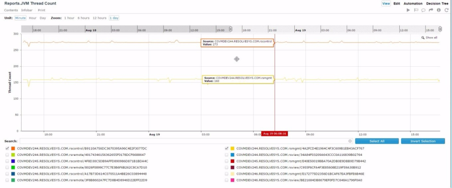 Also included in Report Administration are user-defined metric thresholds, which alert the user during system variability. When a metric data value exceeds a threshold value, the user is notified to take precautionary measures to stabilize the system. For example, a metric threshold can be defined such that when the memory available in the JVM drops below a threshold value of 10% of total memory, the user is notified to increase the amount of memory.