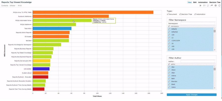 - The average rating of the top documents (with number of documents displayed selected by the user). The user can filter the data to see the average rating of the document types, namespaces, and authors of documents from the selection list.